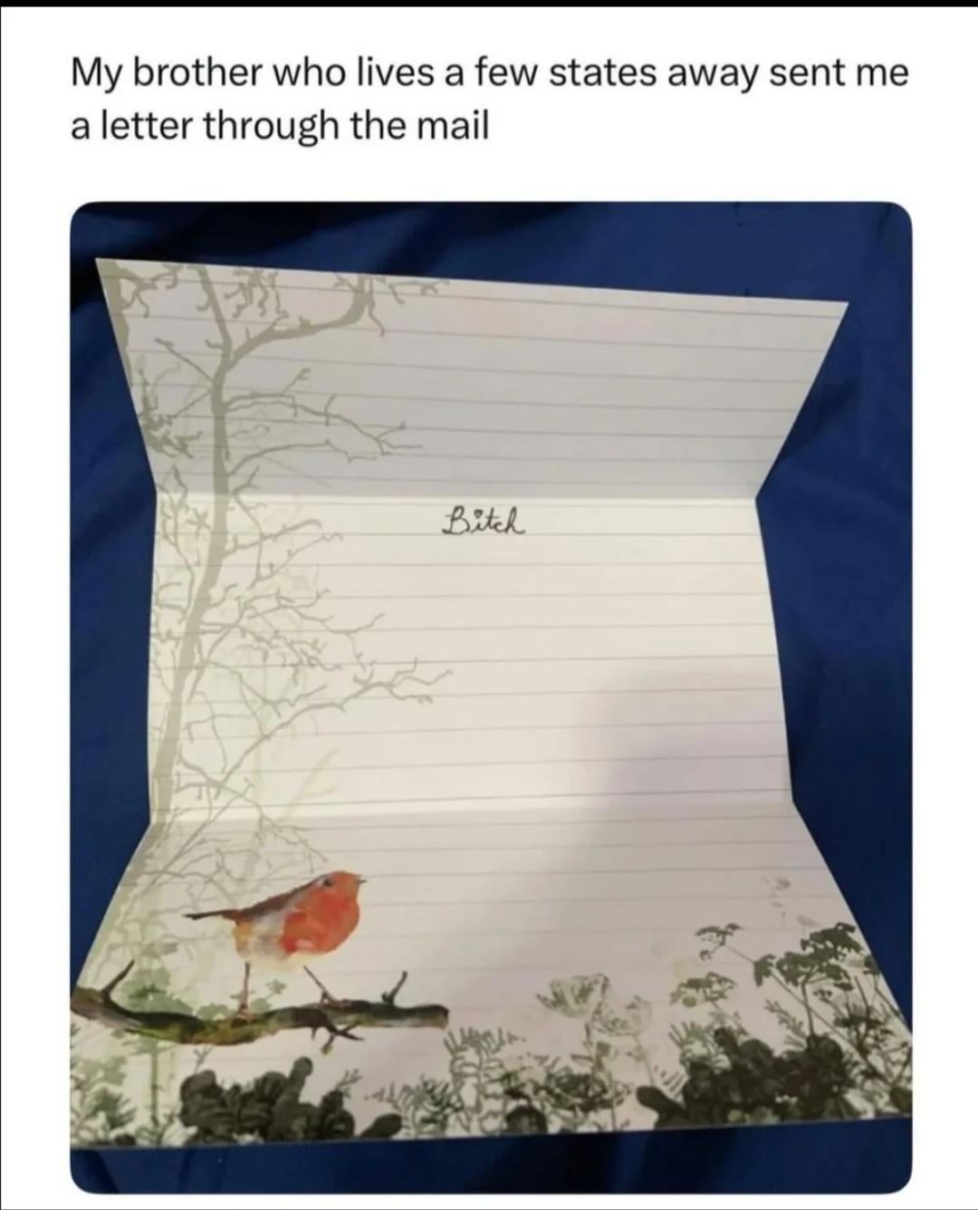 MrZeddd on April 26, 2026 2:31 pm Lmao this unlock a core memory I haven’t thought about in awhile, a friend of mine did something similar in early 2000s after moving away It was one of those nice postcards with a song when you open the, all he wrote was “Fucktards”
