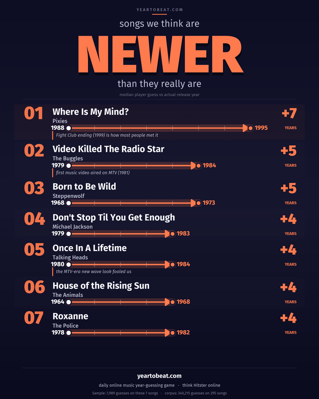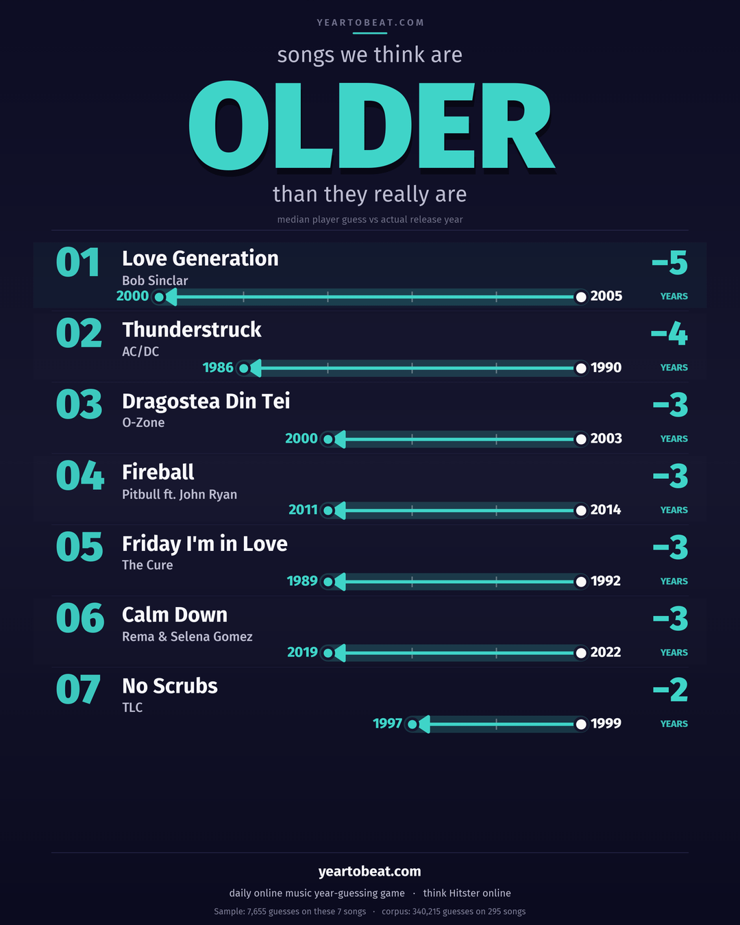 [OC] The 14 songs players misdate the most, across 340,000 guesses on a Hitster-style online music year-guessing game by Take_My_Money