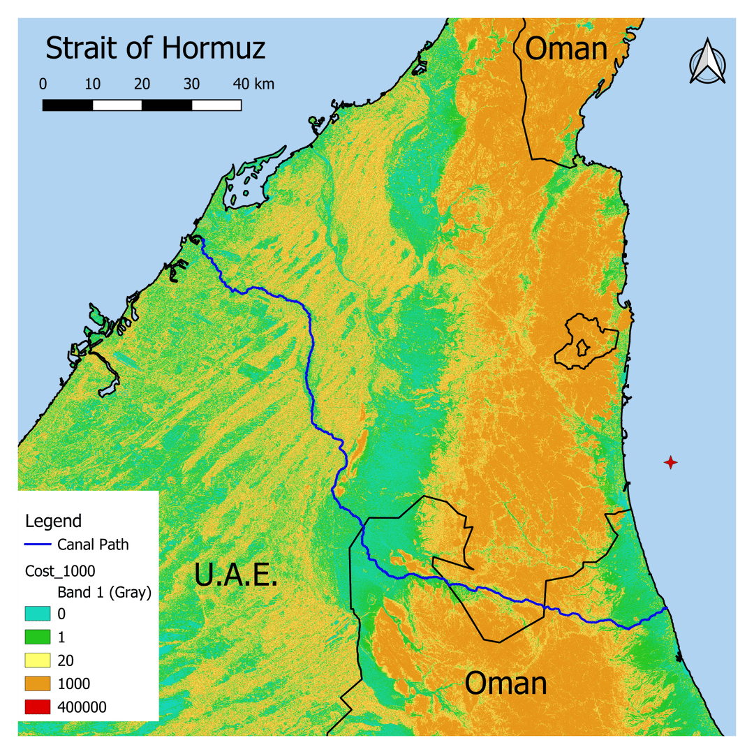 Given current global affairs, I decided it would be fun to calculate a Least Cost Path that bypasses the Strait of Hormuz while I teach myself QGIS. In GIS, a least-cost path assigns a 'cost' to each pixel in a raster and computes the path with the lowest cost using a pathfinding algorithm such as Dijkstra's.
