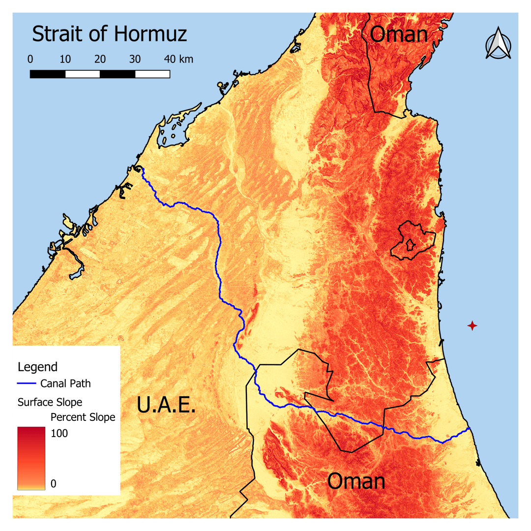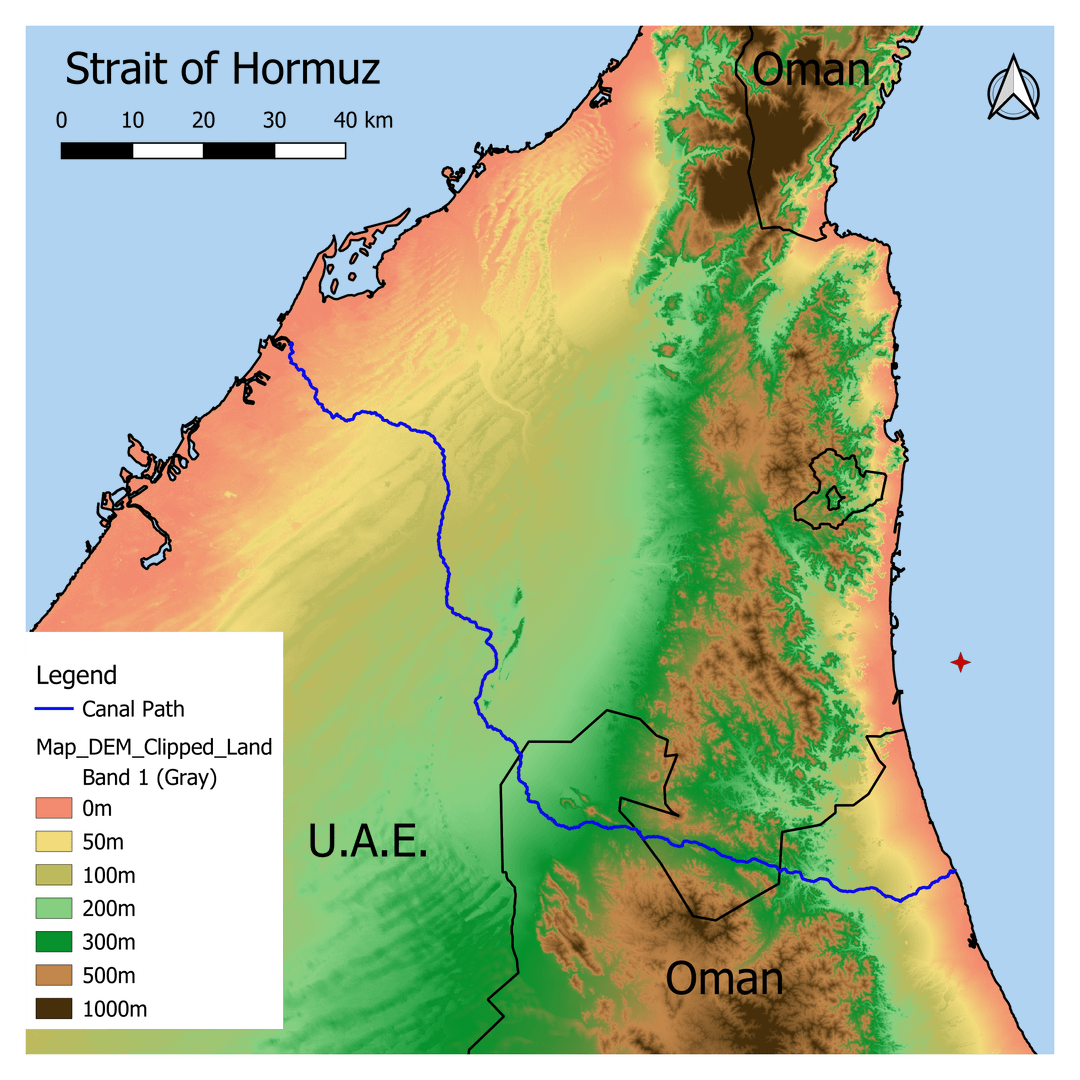 TL;DR : Concept of a plan for a canal by-passing the Strait of Hormuz. derived from elevation and slope datas. (and rainbows)