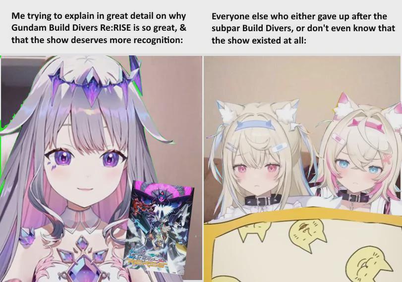 Unlike its predecessors (Build Fighters, Build Fighters TRY, Build Divers), which were fun but very obviously “shows about Gunpla / toy commercial with plot dressing”, Re:Rise breaks the mold entirely by being a more grounded character-driven drama focused on telling a compelling story about broken people learning to heal, and finding purpose through each other…. that just happens to include Gunpla, VRMMORPGs, and isekai elements. Re:Rise isn’t really about becoming better at Gunpla like the previous Build series, but rather it’s about becoming better people.