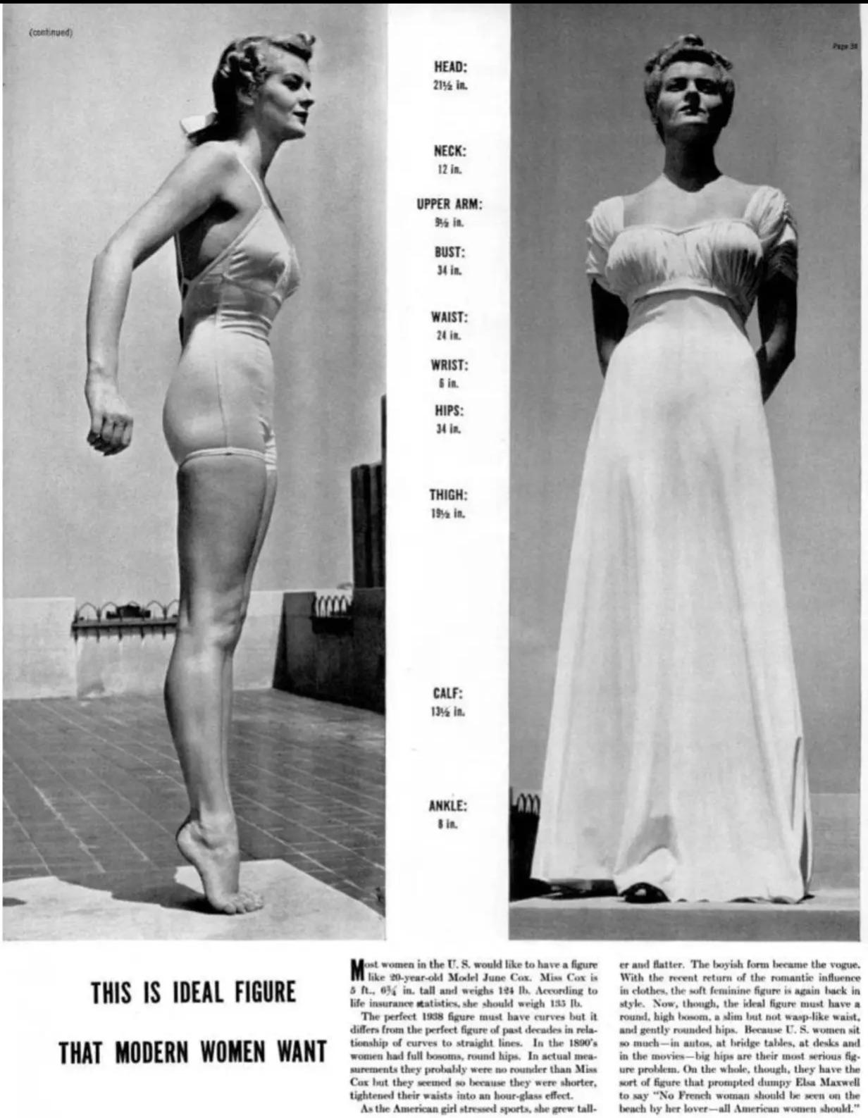 The perfect 1938 figure must have curves but it differs from the perfect figure of past decades in relationship of curves to straight lines. In the 1800s women had full bosoms, round hips. In actual measurements they probably were no rounder than Miss Cox but they seemed so because they were shorter, tightened their waists into an hour-glass effect.