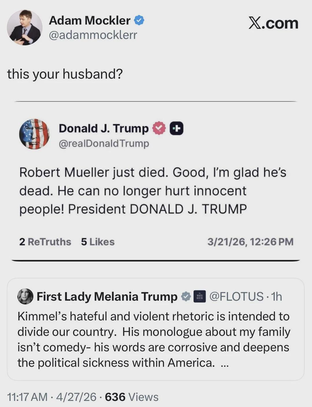 tarahunterdar on April 28, 2026 10:12 am Melania didn’t write this obviously. The only question is this: Was this written by an assistant or plagiarized off of someone else?
