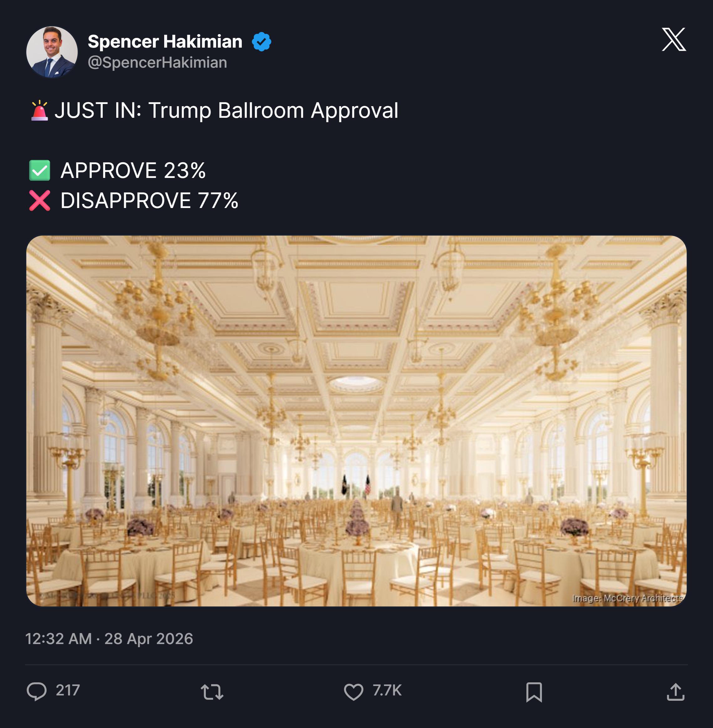 Trump will see this and immediately claim he needs the ballroom due to overwhelming public support for it