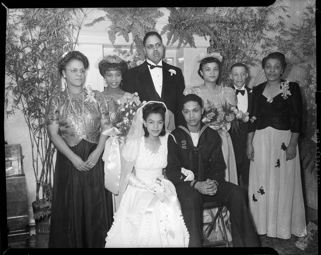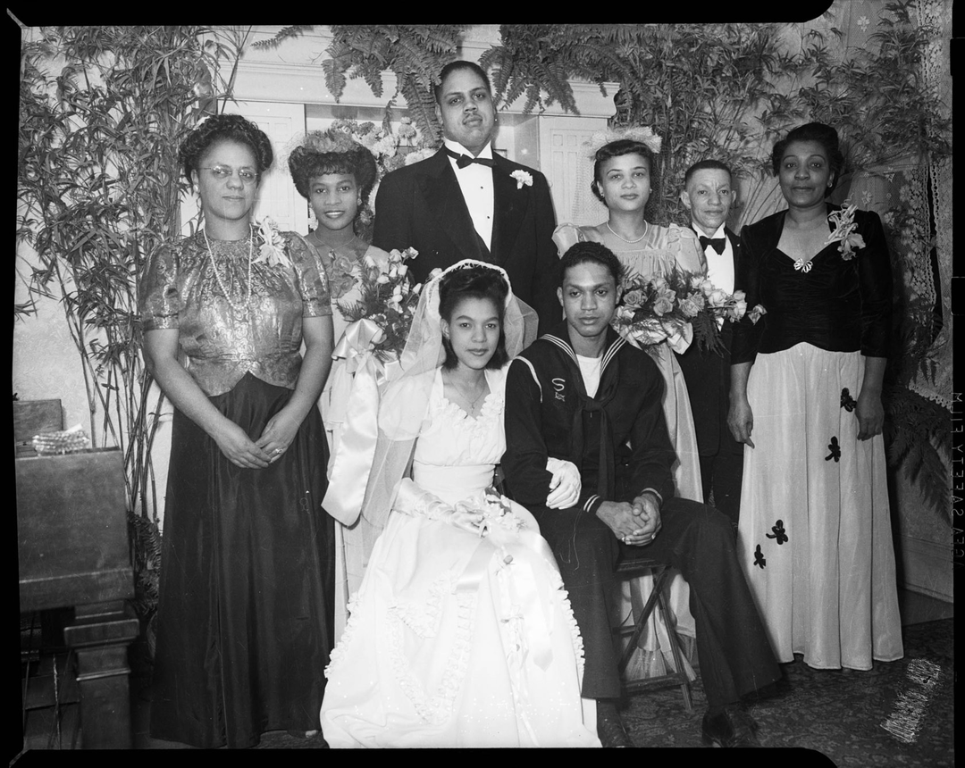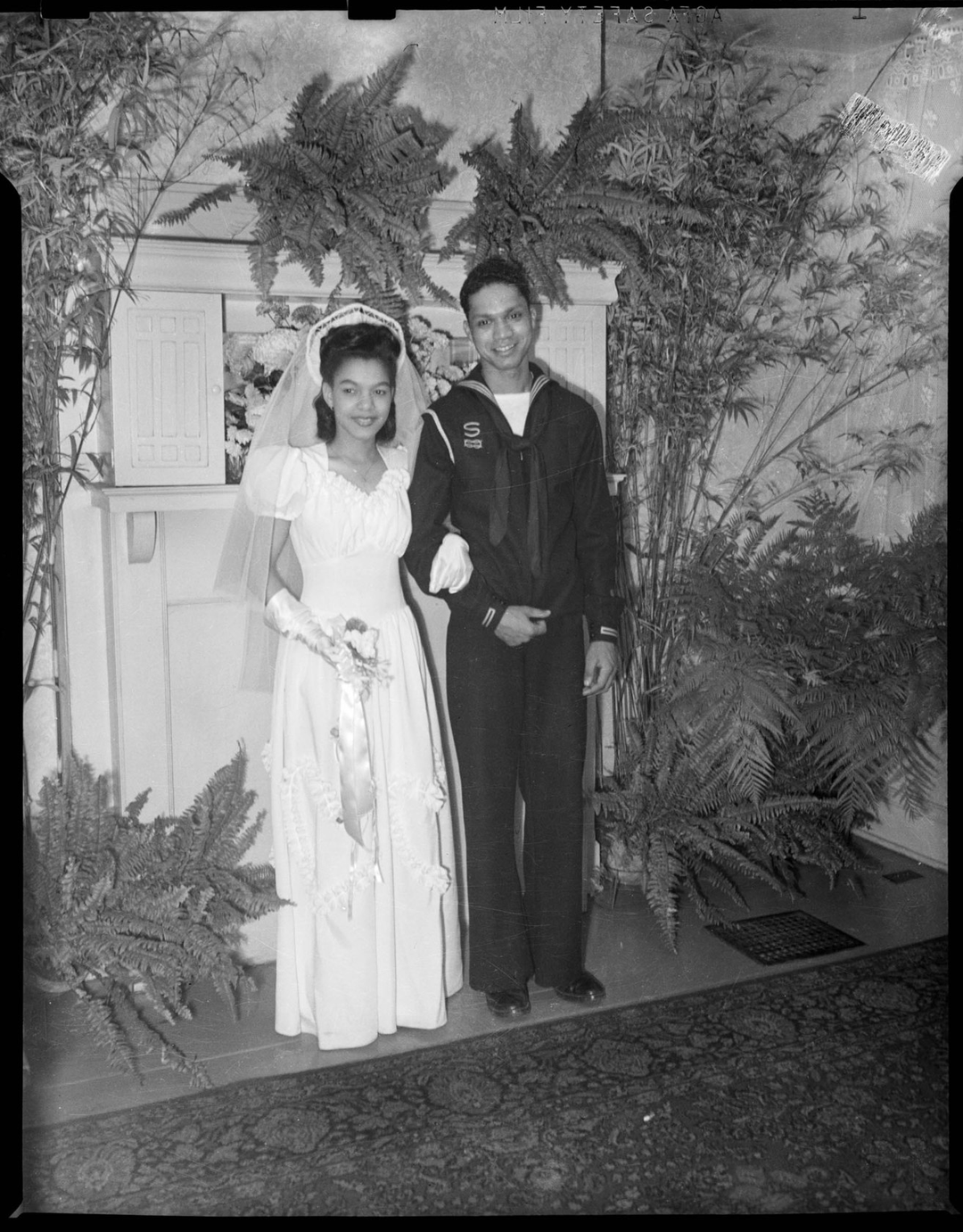Share Facebook Twitter LinkedIn Pinterest Bluesky Threads Young couple poses for their wedding photos during WWII, Pennsylvania, circa 1940s. by Electrical-Aspect-13