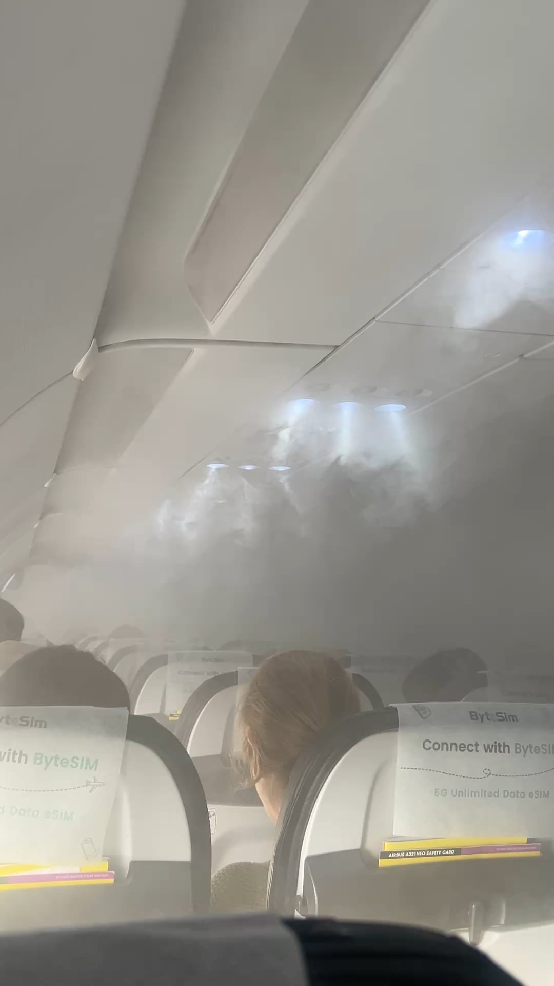 The AC on planes blasts very cold, dry air. If the cabin already has warm, humid air (people breathing, boarding in a humid climate, etc.), that cold air rapidly drops the temperature of the surrounding air below its dew point. The moisture can’t stay vapor anymore, so it condenses into tiny droplets, which you see as fog.