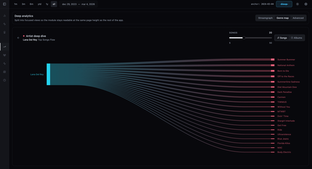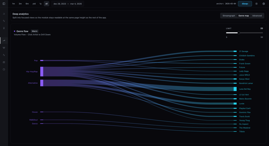 I also used Sankey flow diagrams to map how my listening volume flows from broad Genres down to specific Artists and Albums.