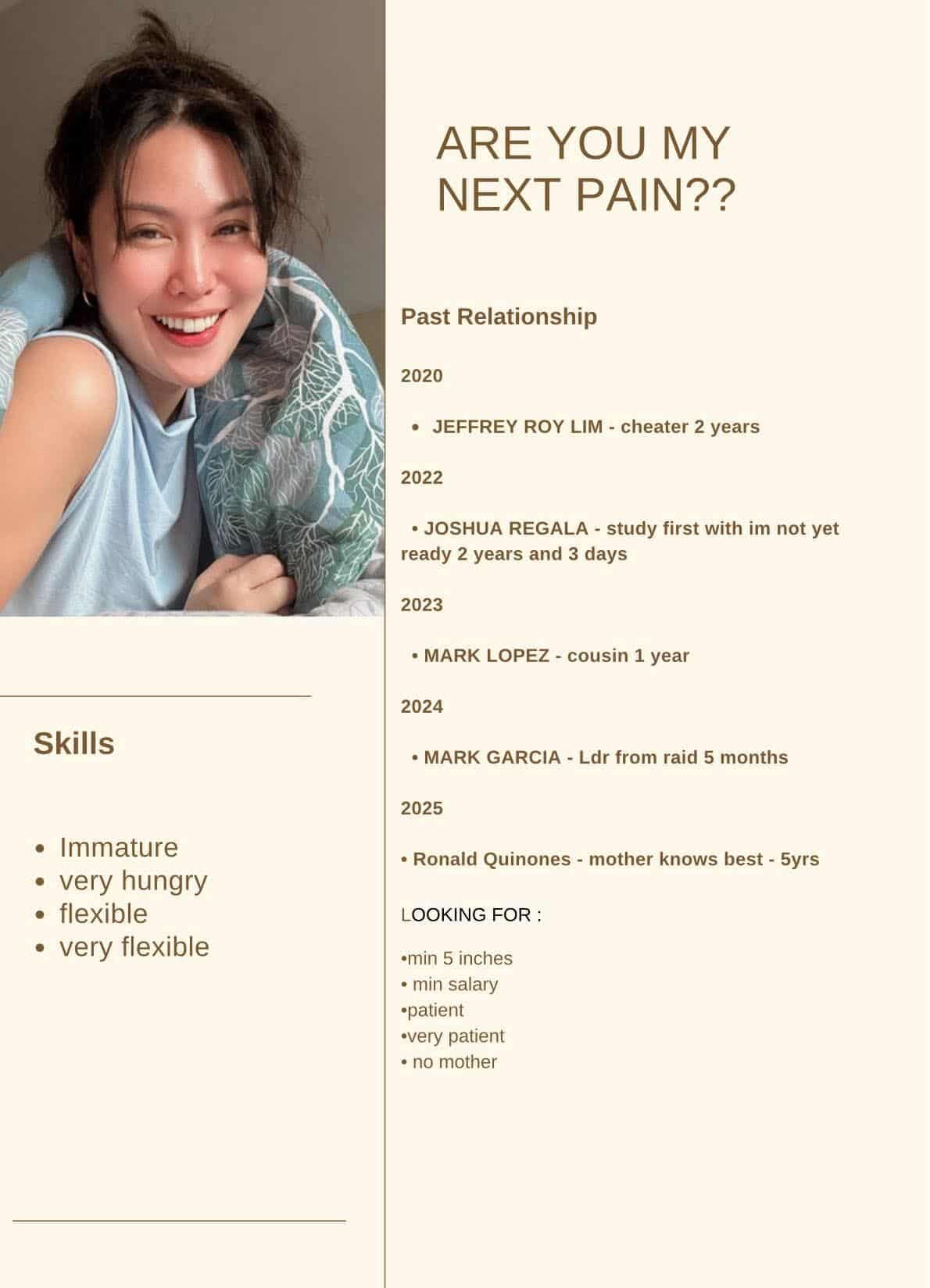 Notice the years and times dating. If this was real it just gives you a heads up to make sure you wrap it up, don’t worry about being faithful because she is not. And get ready to havr fun, because she is flexible.