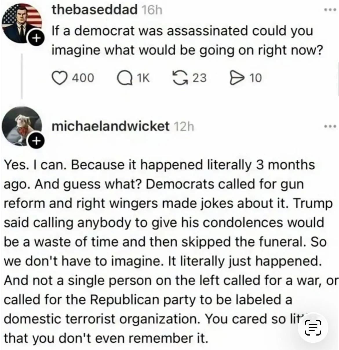 Share Facebook Twitter LinkedIn Pinterest Bluesky Threads If a democrat was assassinated.. by asa_no_kenny