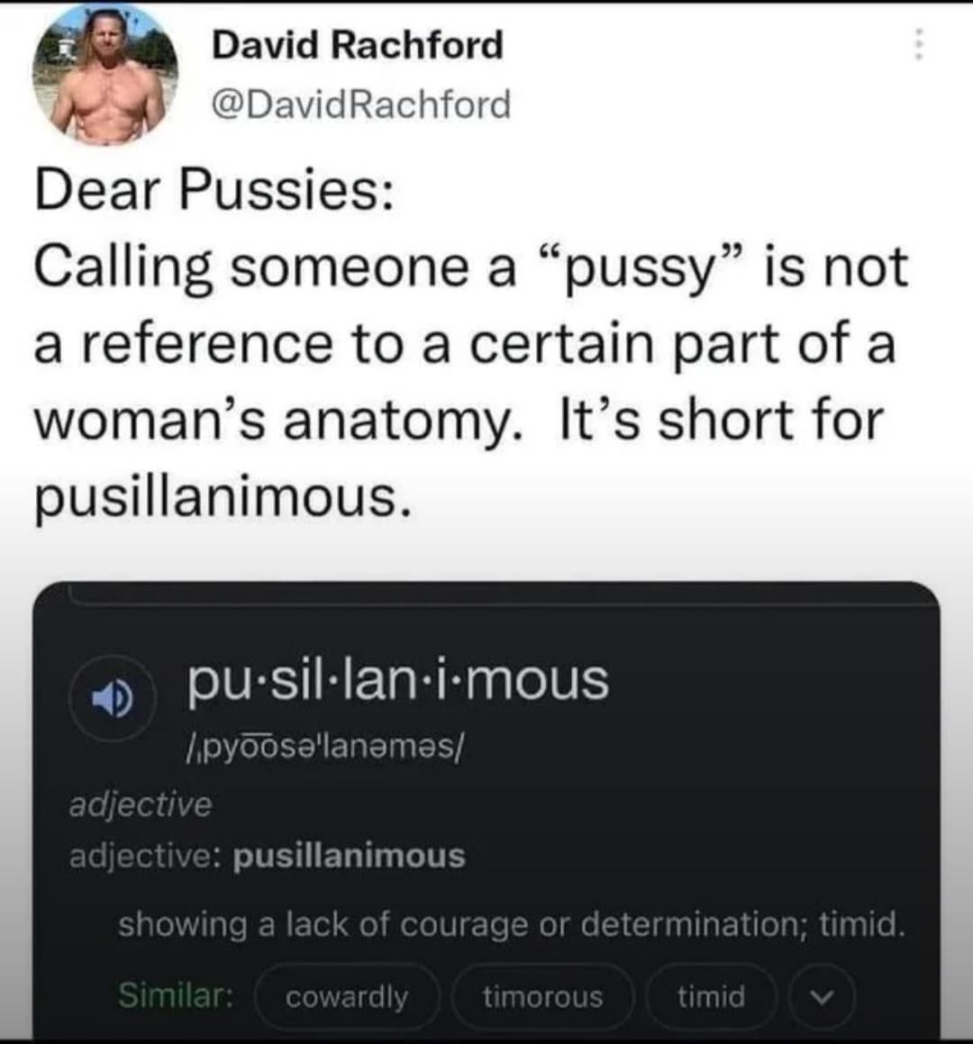 5. This is really funny because back in school I remember calling my mate a wuss, and his retort was “no one says wuss anymore we say pussy, and if you don’t know what pussy means you’re gay”, well I guess it turns out most people are gay then