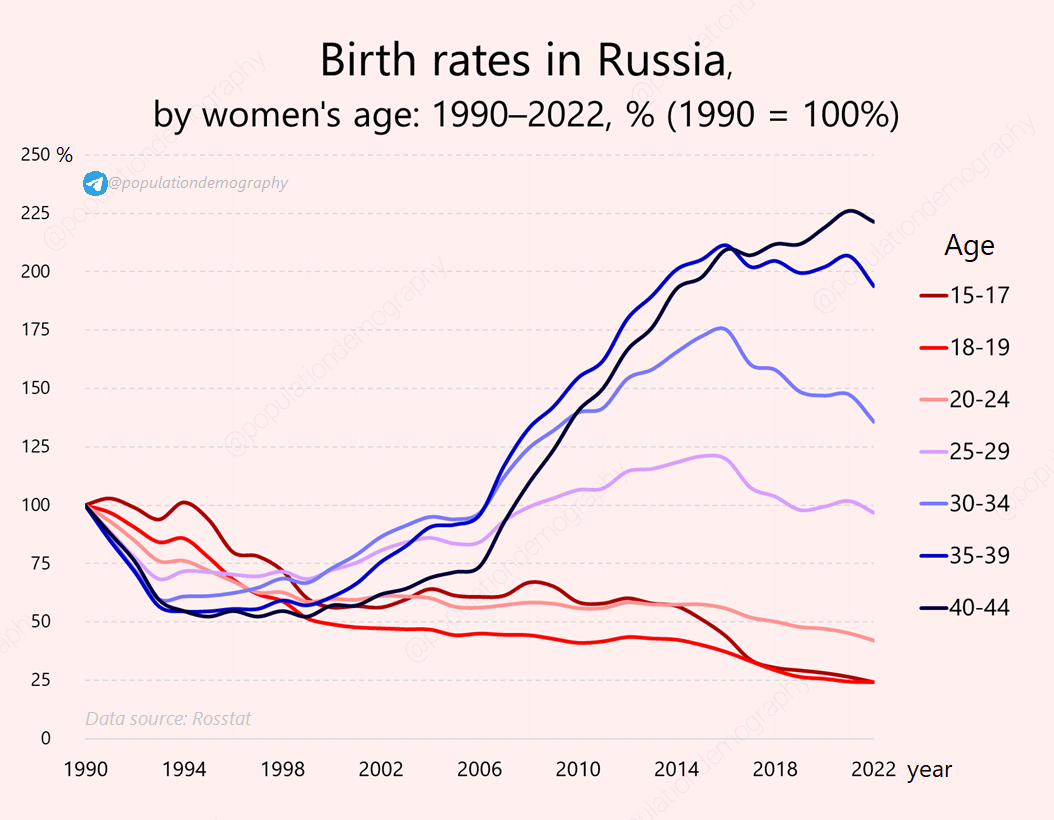 Birth rates in Russia by women’s age: 1990–2022, % compared to 1990 rate, 1990 = 100% [OC] by Populationdemography