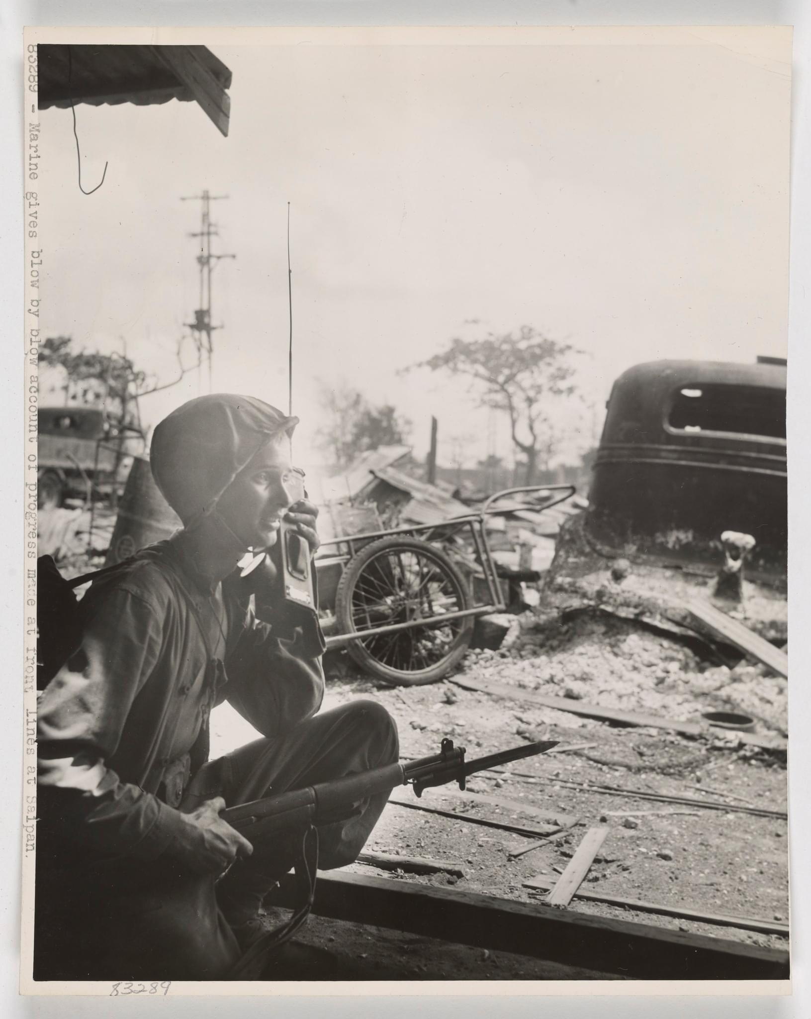 He doesn’t look a day over 16- From the shelter of a wrecked building in Garapan on Saipan, a Marine communicator Informs his headquarters of the progress made by front line troops as they enter the town. (NARA photo, 1944) [1631×2048]