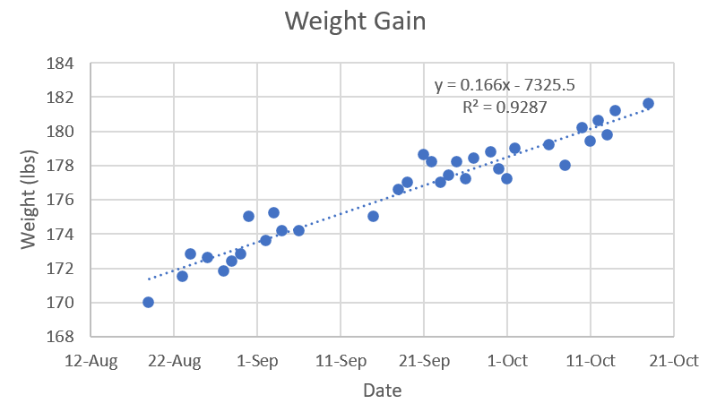 [OC] Two months of intentional weight gain. Weight data collected in the morning after peeing and before consuming anything. Microsoft excel was used to generate graph.