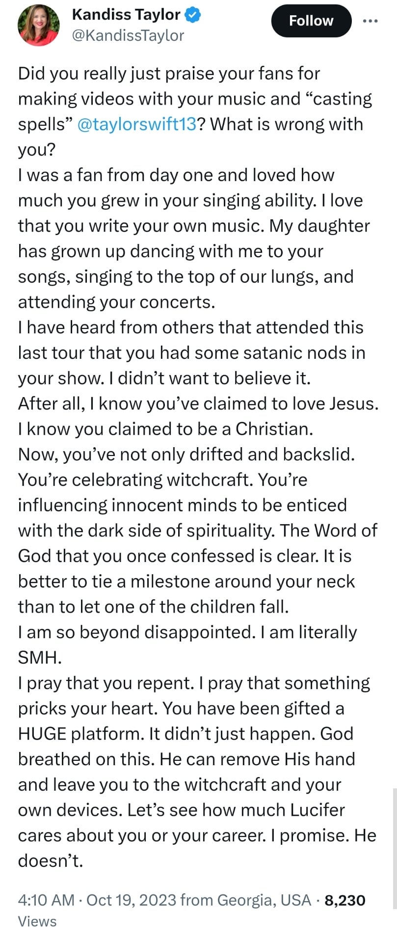 Oh, Kandiss. Go take that tragedeigh of a name of yours and pound sand. I can assure you that Taylor doesn’t give a rat’s ass about what you think.