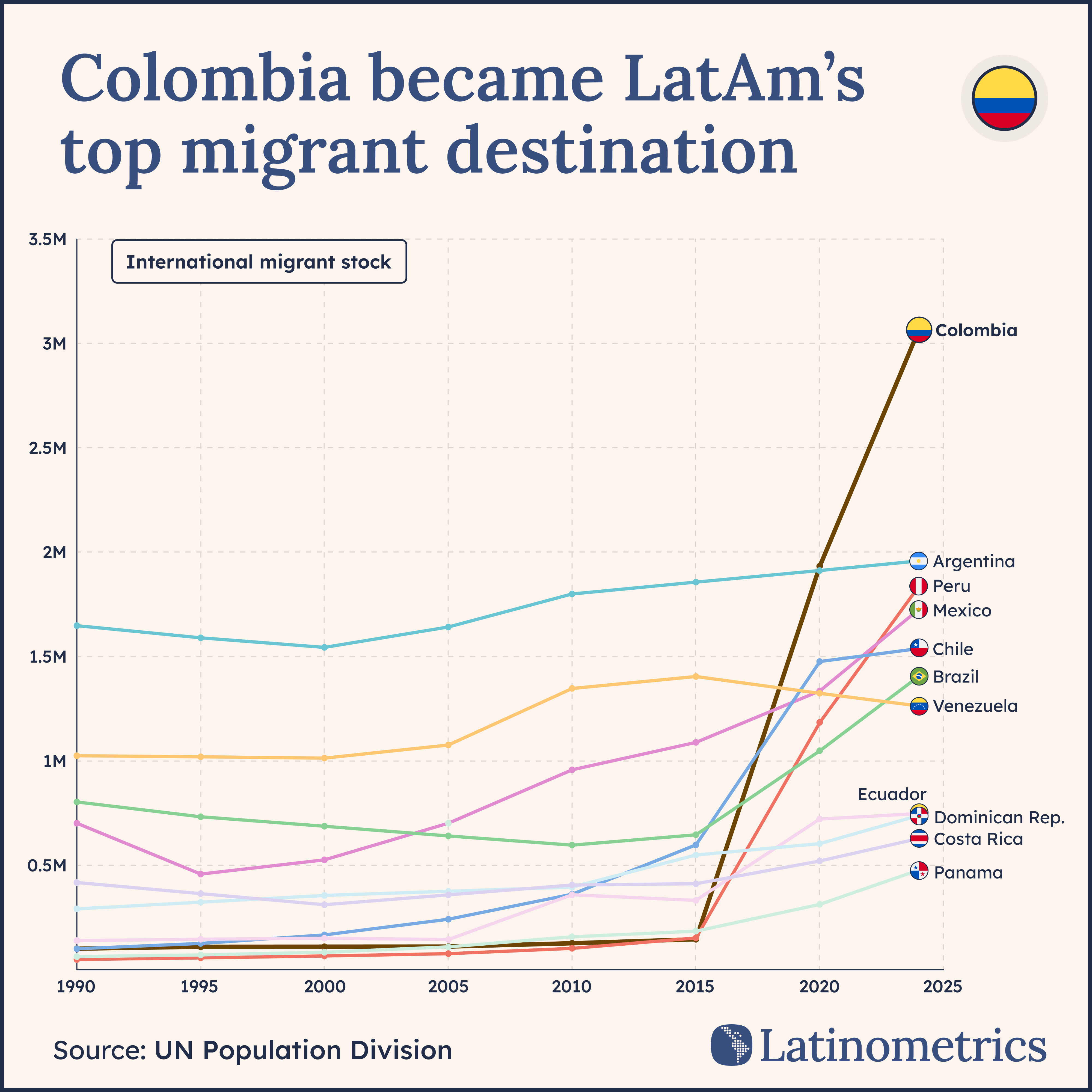 🇨🇴 📊 Colombia is now hosting more immigrants than China, India, France, and Germany. For a developing nation of 50 million, this is unprecedented. Here's what's happening ↓